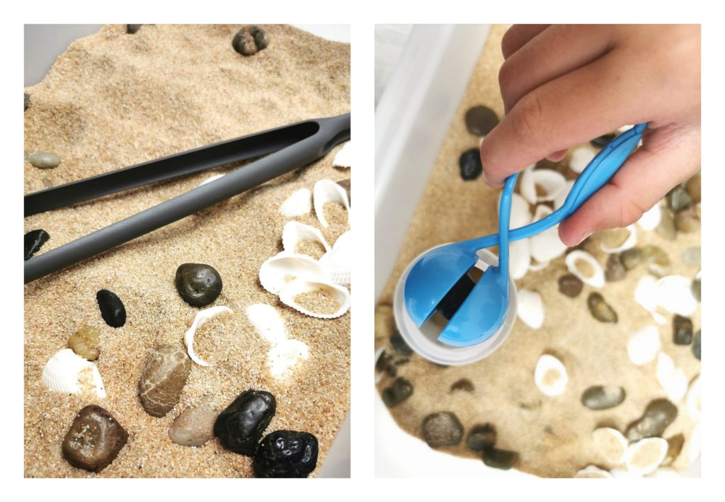 Chciałabym powiedzieć, że nie byłabym sobą gdybym z wakacji nie przywiozła tony muszli, muszelek i kamieni… niestety w tym roku był deficyt muszli 🙁 dlatego kupiłam muszelki w sklepie :/ no trzeba sobie jakoś radzić 🙂  Na początek zaczynamy od wybierania muszelek i kamieni z kuwety z piaskiem. Dziecko przy pomocy chwytaków wyciąga muszelki i kamienie. To doskonałe ćwiczenia doskonalące funkcję stabilizacyjną i manipulacyjną rąk (Modyfikacja dla ćwiczeń artykulacyjnych – na kamieniach i muszelkach możesz zapisać ćwiczoną głoskę w izolacji, sylabie czy też wyrazie).