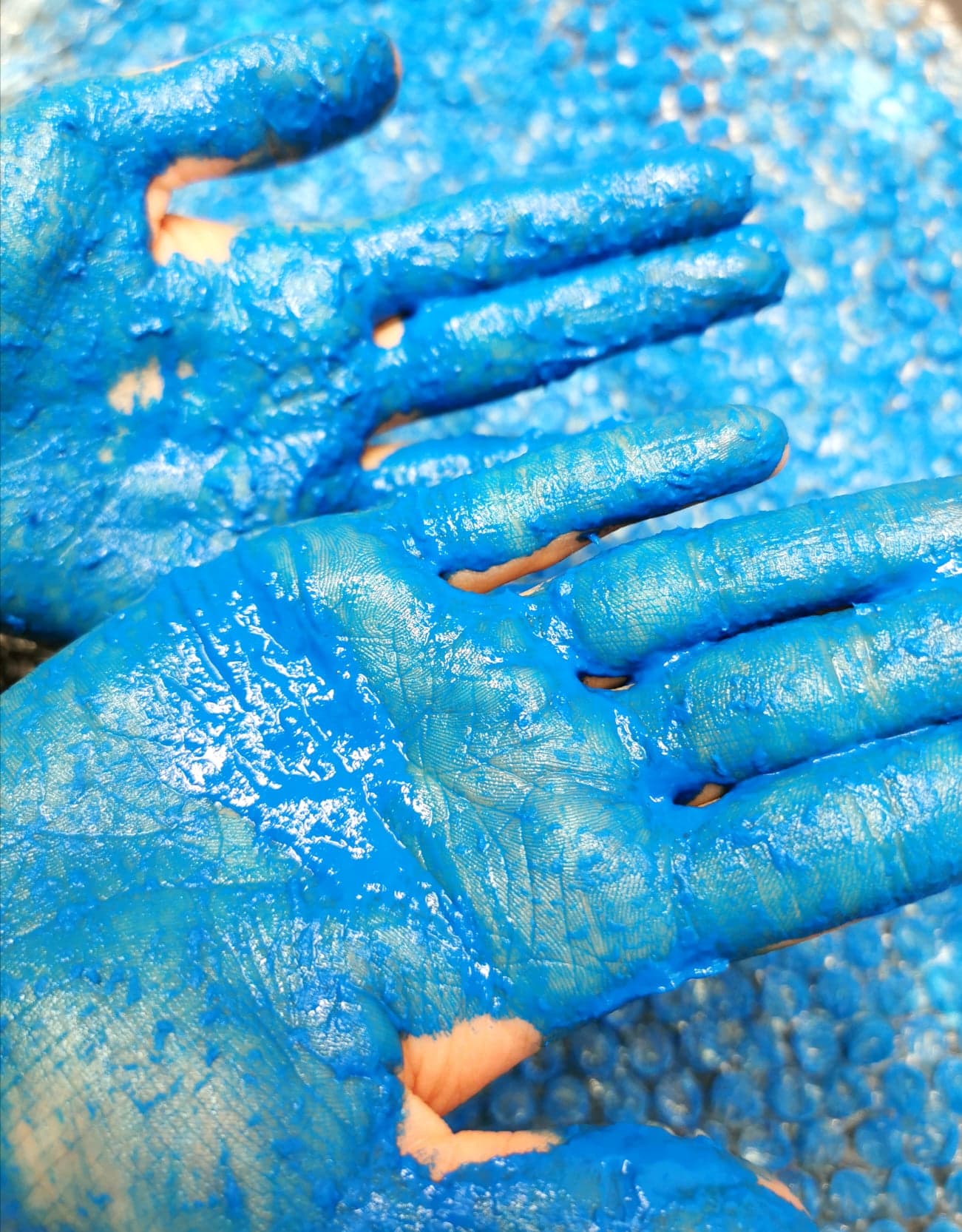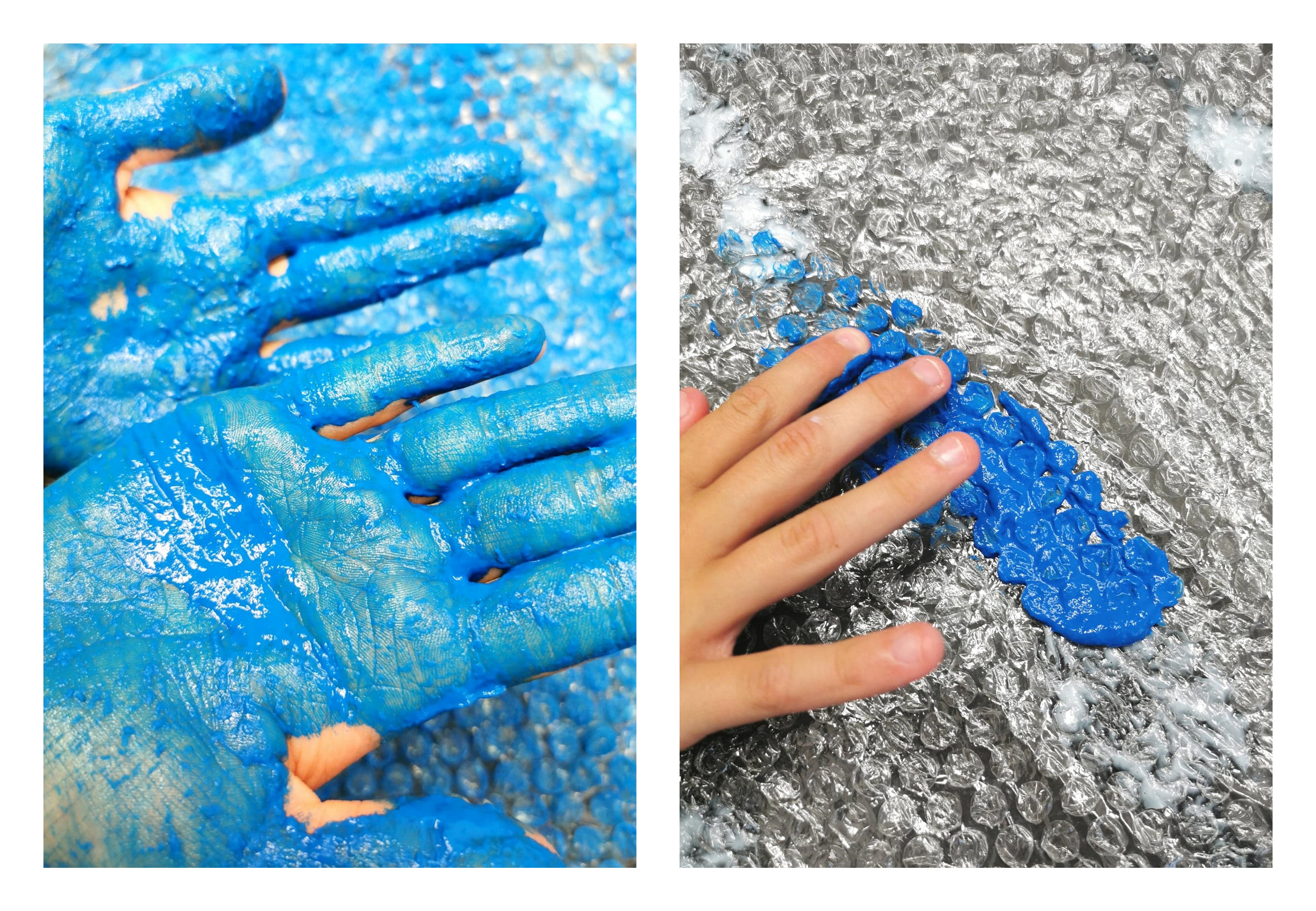 Zaczynamy od przyklejenia folii do brystolu. Zanim ją przykleicie, poproś dziecko żeby przez chwilę „powyciskało” bąbelki, to świetna praca dla małych paluszków. Następnie przyklejcie folię  – do klejenia użyjcie kleju który trzeba rozsmarować ręką, dzieci z dużą nadwrażliwością mogą użyć pędzla. Kolejny krok to pomalowanie folii na niebiesko, malujcie palcami, całą ręką, stopami… niech ciało dostanie jak najwięcej informacji dotykowych.