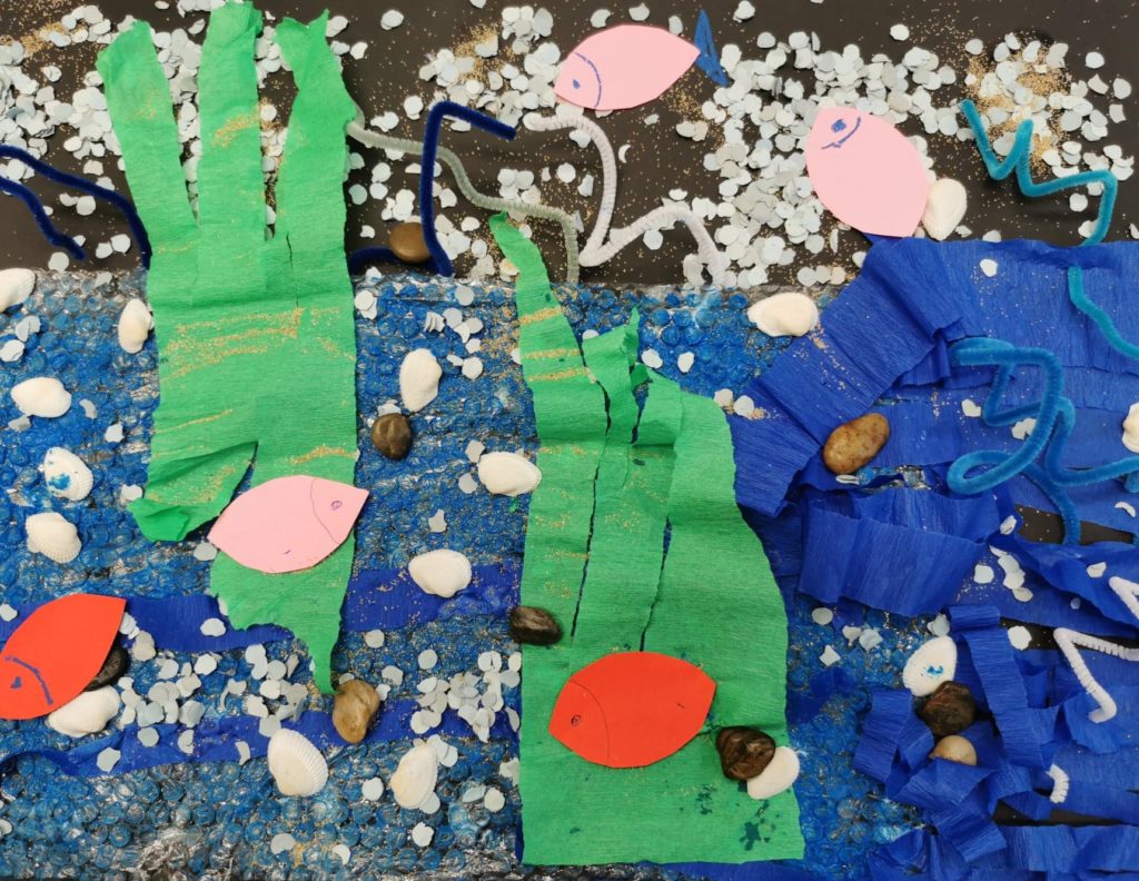 Żeby było ładniej i bardziej kolorowo, z zielonej bibuły stwórzcie wodorosty – bibułę rozrywajcie, zgniatajcie, róbcie z niej kulki, niech ręce wykonują jak najwięcej różnych czynności.
