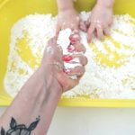 Do dużej miski wsyp mąkę ziemniaczaną, a następnie cały czas ugniatając, dodawaj olej. Niestety nie podam Ci dokładnych proporcji, zawsze robię to „na oko”. Generalnie Twoim celem jest uzyskanie masy o konsystencji zbliżonej do śniegu. Tę masę uwielbiam przede wszystkim za wrażenia dotykowe. Jest to najbardziej delikatna, aksamitna, najcudowniejsza w dotyku masa jaką kiedykolwiek robiłam. Świetnie się skleja, z powodzeniem zastąpi piasek kinetyczny. Często wykorzystuję ją na zajęciach z terapii ręki, ale też w celu uatrakcyjnienia zajęć logopedycznych, czy stymulacji sensorycznej w pracy z różnymi zaburzeniami, również „niejadkami”.
