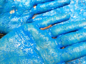 Zabawa jest na prawdę świetna i mocno zajmująca. Dziecko w trakcie tej aktywności ćwiczy rysowanie, wycinanie… jednym słowem pracuje nad motoryką małą i podnosi swoje kompetencje grafomotoryczne. My dodatkowo użyłyśmy materiałów o różnych fakturach, dzięki temu nasza praca była także stymulacją sensoryczną, Tobie również polecam takie rozwiązanie. I pamiętaj, że najlepszy klej to ten wyciskany, który trzeba rozsmarować paluchem bo przecież im więcej wrażeń dotykowych, tym lepiej.