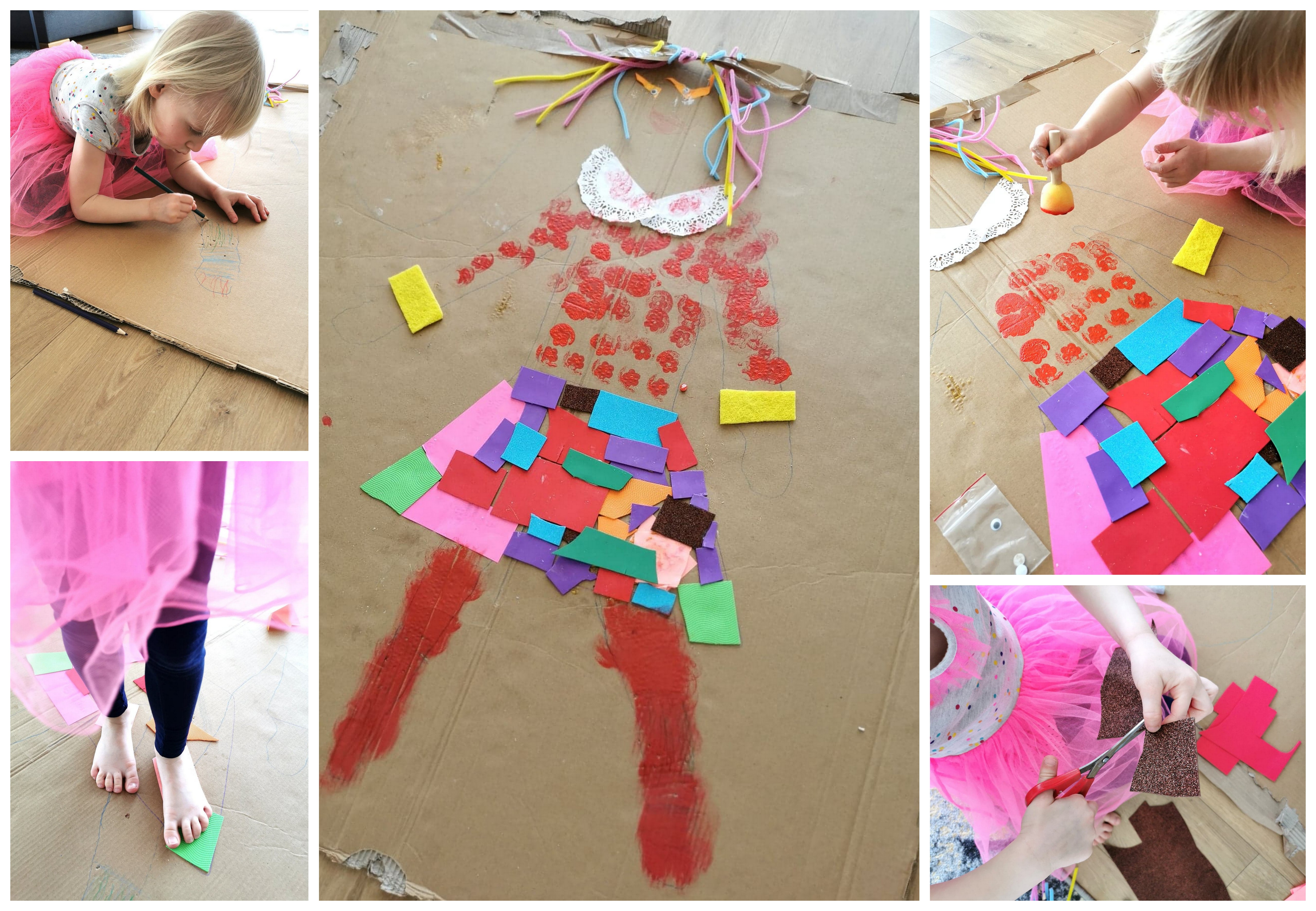 Na kartonie narysuj postać, możesz po prostu odrysować swoje dziecko (my tak zrobiłyśmy, Iga była zachwycona), następnie dorysuj ubrania (u nas bluzka i spódnica) a teraz poproś dziecko, żeby dorysowało oczy, usta….. oraz przyozdobiło ubranie. I to tyle w temacie instrukcji.